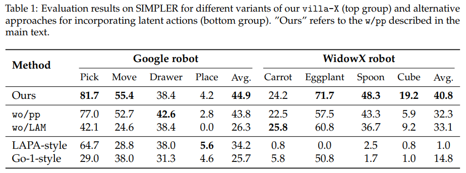 与LAPA和Go-1等潜在动作方法的对比显示,villa-X在SIMPLER环境中的平均成功率显著更高,证明了其集成机制的有效性。