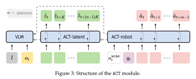 ACT模块基于预训练的VLM(如PaliGemma),接收文本指令l和初始视觉观测ot,输出机器人动作序列。其结构包含三个子组件:VLM、ACT-latent 和 ACT-robot。VLM负责提取视觉和语言特征;ACT-latent 基于扩散目标建模n步潜在动作序列zt,zt+K,…,zt+(n−1)K;ACT-robot 同样基于扩散模型,预测m步低层机器人动作,条件依赖于VLM特征和潜在动作序列。