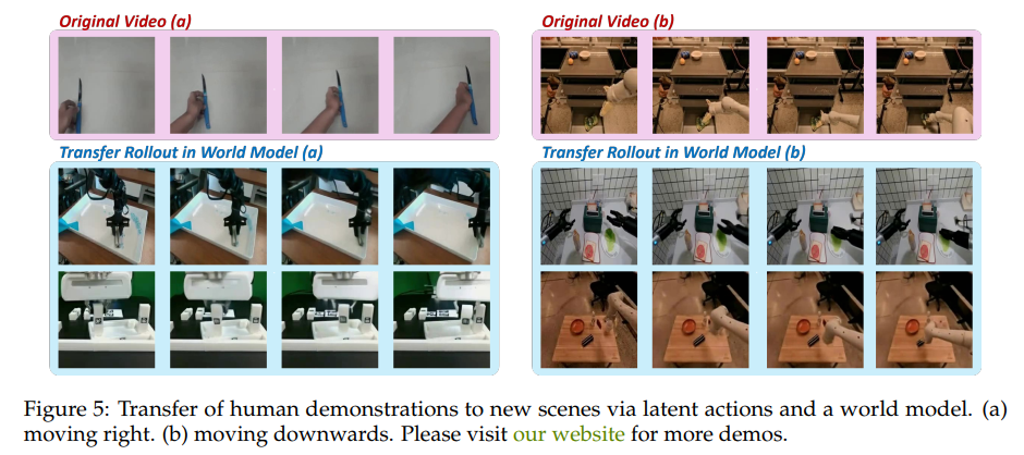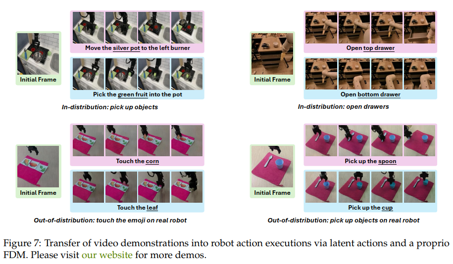 通过世界模型将ACT-latent生成的潜在动作序列渲染为未来视频,验证其规划能力。实验表明,模型能够根据语言指令识别目标物体并生成符合任务要求的潜在动作序列,即使在分布外场景中也能保持较好的泛化能力。