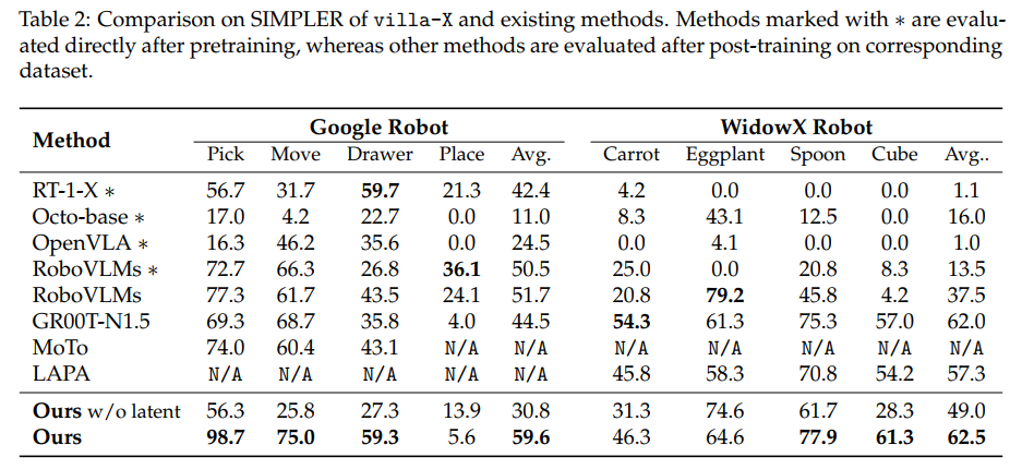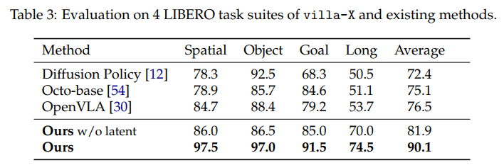 villa-X通过改进潜在动作的学习方式及其在VLA预训练中的融合机制,在多个仿真环境(如SIMPLER和LIBERO)和真实机器人平台(包括夹爪和灵巧手操作)中均取得了优越性能。潜在动作作为连续帧之间的抽象表示,能够捕捉运动语义,充当模仿学习中的伪动作标签,并利用大量无动作标注的视频数据增强策略训练。