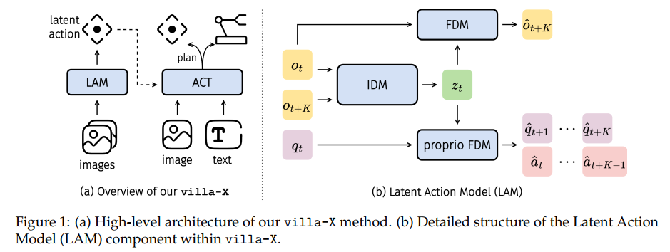 LAM负责从一对观测帧中推断潜在动作。其核心是一个逆动力学模型(IDM),用于从相邻视频帧ot和ot+K中提取潜在动作zt,其中K为可配置的窗口大小,用于平衡运动的可感知性和泛化能力。与以往仅基于视觉重建损失的方法不同,villa-X引入了 proprio Forward Dynamics Model(FDM) 作为辅助解码器,预测未来机器人状态和动作。