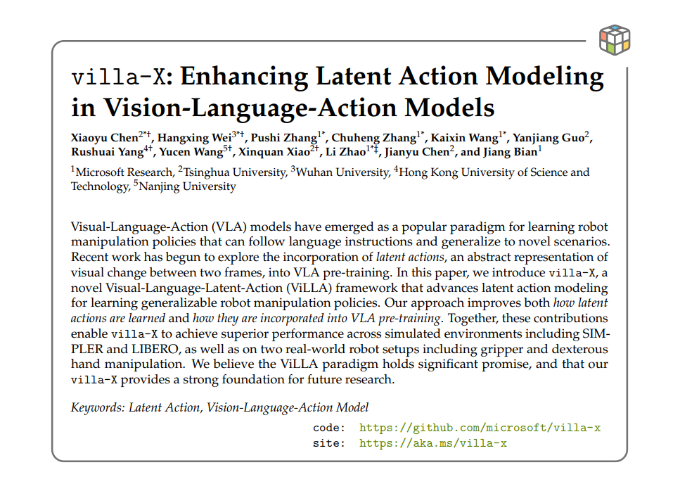 导读:视觉-语言-动作(Vision-Language-Action, VLA)模型已成为机器人操作策略学习中的重要范式,能够根据语言指令执行任务并泛化至新场景。近年来,研究者开始探索将潜在动作(Latent Actions)——一种对连续帧间视觉变化的抽象表示——引入VLA预训练中。论文提出了一种名为villa-X的新型视觉-语言-潜在动作(ViLLA)框架,显著提升了潜在动作的建模方式及其在VLA预训练中的融合效果。