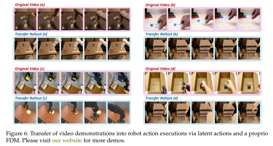 通过探针实验评估潜在动作与机器人动作的对应关系。实验表明,引入proprio FDM的模型(w/pp)在预测误差分布上显著优于无该模块的模型(wo/pp),说明其能更好地捕获机器人动作信息。在策略预训练中,w/pp 在SIMPLER环境中平均成功率更高,且显著优于不使用潜在动作的基线(wo/LAM)。