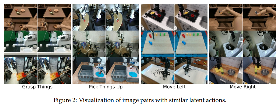 论文进一步阐述了潜在动作在VLA预训练中的重要性。现有方法如LAPO、Genie、Dynamo等虽在视频游戏或仿真环境中取得进展,但在机器人学习中仍面临潜在动作与底层机器人状态和动作之间缺乏对齐的问题。