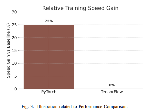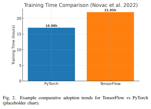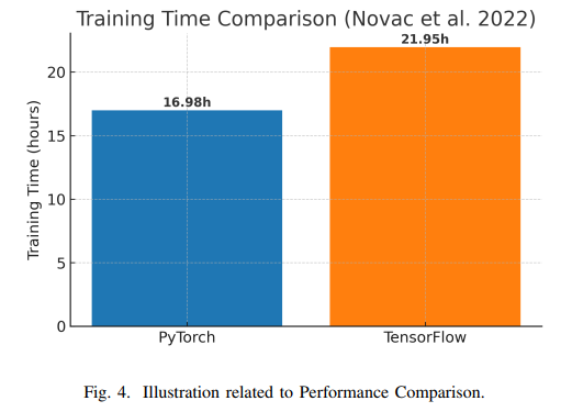 Novac等人通过对卷积神经网络的实验发现,PyTorch在总训练时间上比TensorFlow快约25.5%。具体而言,PyTorch完成训练需16.98小时,而TensorFlow需21.95小时。进一步分析表明,PyTorch的单步训练时间(0.0008693秒)比TensorFlow(0.0011189秒)快约28%。这些结果与社区反馈一致,表明PyTorch的后端实现(基于cuDNN和优化点操作)具有较高的效率。需要注意的是,TensorFlow在某些场景下可通过手动调优(如启用XLA编译或使用@tf.function)进一步提升性能,而PyTorch在大多数情况下无需额外配置即可达到良好性能。