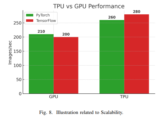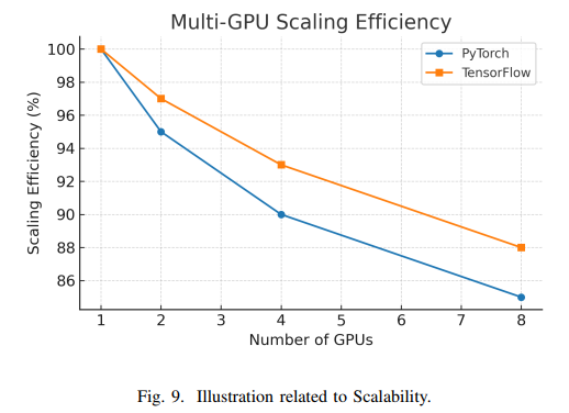 在扩展性方面,TensorFlow凭借其成熟的分布式策略(如MirroredStrategy和TPUStrategy)和多节点训练支持,在大规模计算场景中具有优势。PyTorch的分布式数据并行(DDP)近年来也取得了显著进展,能够在线性扩展多GPU训练。两者在多GPU训练效率上已接近持平,性能差异更多取决于具体实现细节而非框架本身。此外,TensorFlow对TPU的支持更为成熟,而PyTorch通过PyTorch/XLA项目也提供了TPU支持,但在某些高级功能上可能略逊一筹。