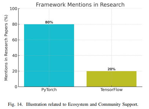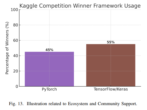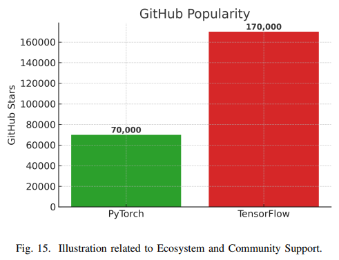 社区规模和活跃度方面,TensorFlow凭借Google的推广和早期优势,拥有庞大的用户基础。PyTorch则在2018-2020年间在研究社区实现爆发式增长。GitHub上的星标数显示,TensorFlow(超过170k)高于PyTorch(超过70k),但这反映了历史累积数据。Stack Overflow 2023年调查显示,8.41%的开发者使用TensorFlow,7.89%使用PyTorch,表明两者在工业界的应用规模相当。Kaggle调查则显示,PyTorch在研究场景中更受欢迎。