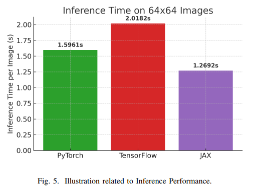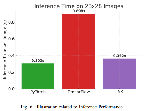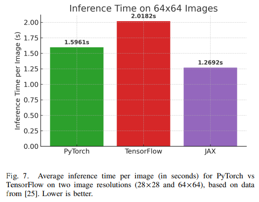 推理性能对于生产环境尤为重要。Bedirovic等人比较了PyTorch、TensorFlow和JAX在图像分类任务上的推理延迟。对于28×28的小图像,PyTorch的平均推理时间为0.3032秒,TensorFlow(Keras)为0.8985秒,JAX为0.3620秒。PyTorch的显著优势可能源于其较低的单次推理开销。对于64×64的较大图像,JAX凭借编译器优化取得最快速度(1.2692秒),PyTorch次之(1.5961秒),TensorFlow最慢(2.0182秒)。这一结果表明,框架性能受输入规模和编译器优化程度的影响较大。