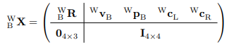 与传统卡尔曼滤波器依赖手工调优的噪声协方差矩阵不同,InEKFormer通过从状态与观测差的历史序列中隐式提取信息来估计卡尔曼增益。该方法适用于存在模型失配和传感器噪声的各类机器人平台。为适应Transformer的固定输入维度,状态矩阵被永久性地扩展为包含左右脚接触信息的SE₄(3)李群形式: