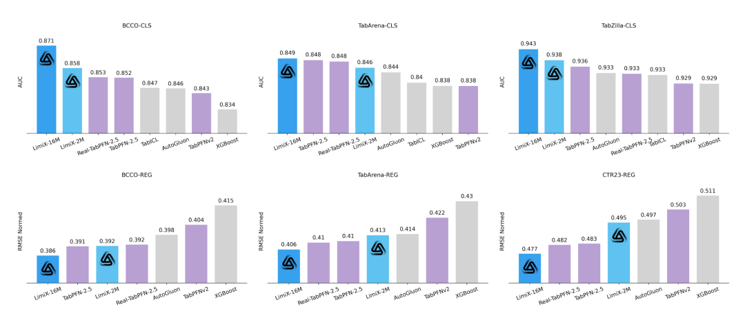 此外,对于近期 Prior Labs 团队的挑战者 TabPFN 2.5,LimiX 成功守擂。可以看到,在涉及分类、回归的六项评测中,LimiX-16M 依然保持着绝对优势。