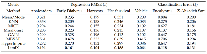 LimiX 还是一个数据填补神器:在现实数据中,经常会有「缺胳膊少腿」的空值。其它预测模型无法直接解决这个任务,而 LimiX 可以像填空一样,精准预测并补全这些缺失值,且无需额外训练。在所有缺失值插补算法中,LimiX 以绝对优势拿下了 SOTA。