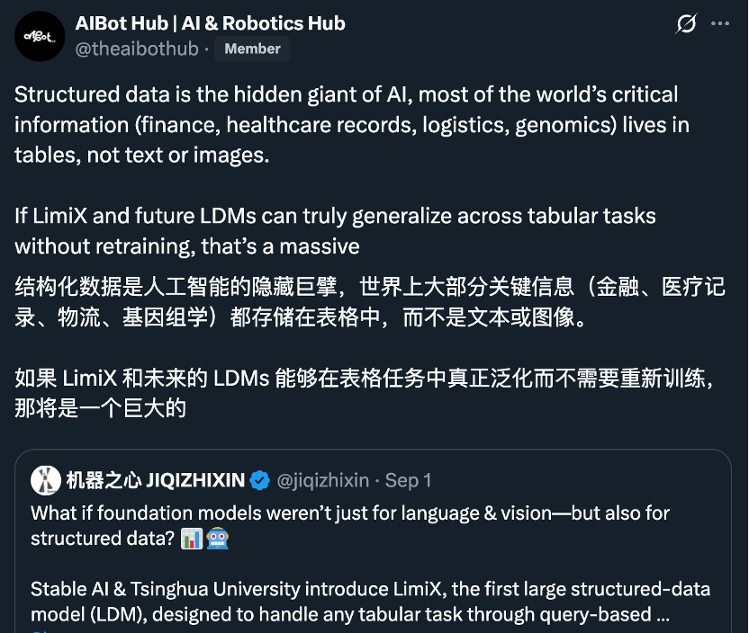 这也是为什么,前段时间清华大学与稳准智能联合发布的 LimiX 系列模型让人眼前一亮。作为他们提出的「LDM(结构化数据大模型)」的重要成员,LimiX 做到了 LLM 没有做到的事情,把结构化数据的处理带入了大模型时代。这会改变整个工业 AI 的游戏规则,成为 LLM、具身智能之外通往 AGI 的另一大关键路径。