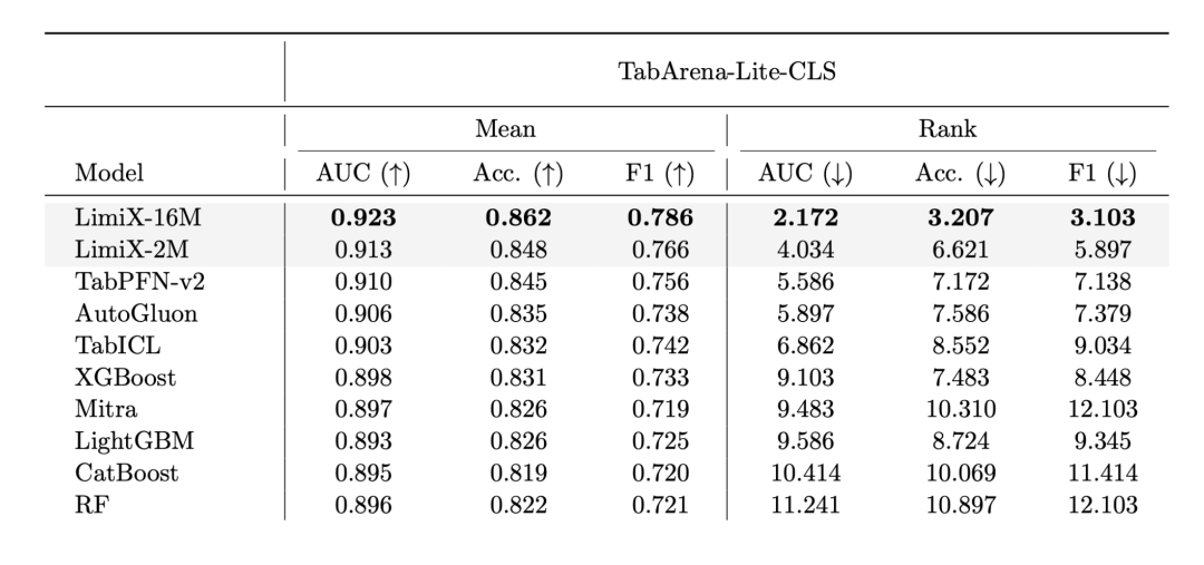 是的,LimiX-2M 虽然体积小,但性能却着实惊人:力压 TabPFN-v2 和 TabICL,超越集成学习框架 AutoGluon,仅次于其大哥 LimiX-16M。