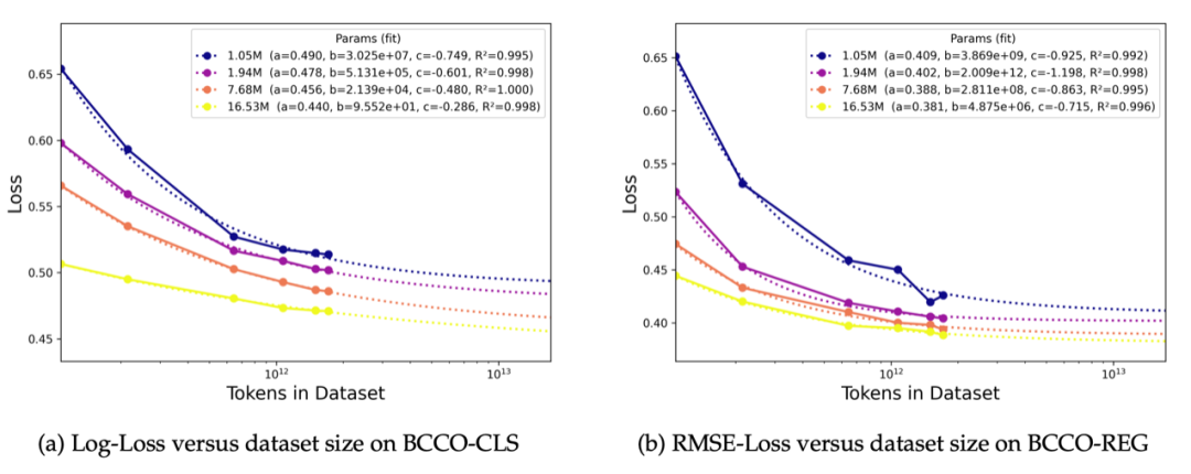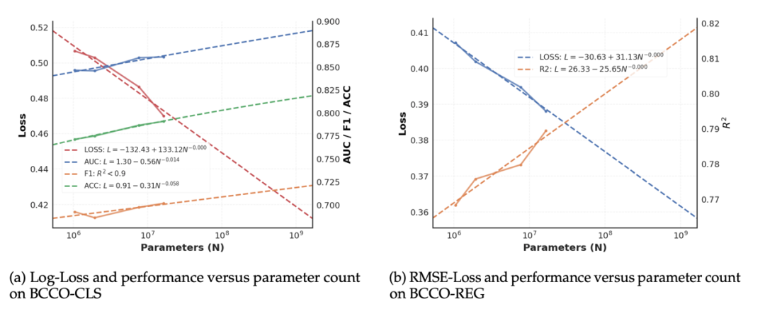 不同参数量模型的分类(左)、回归(右)损失函数随训练数据量的变化趋势。数据量增大时,损失值先快速降低后缓慢下降。
