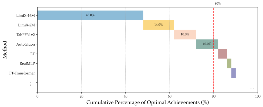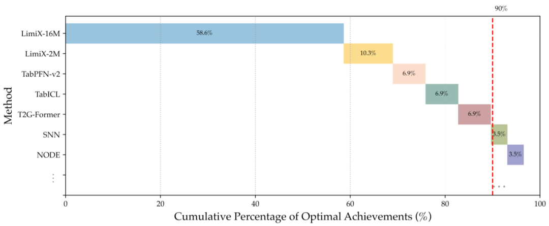 比如在一场分类任务的对决中,LimiX-16M 在 58.6% 的数据集上都取得了最优结果,断崖式领先。如果再加上其轻量级版本 LimiX-2M 的成绩,整个 LimiX 家族的胜率甚至可以达到 68.9%。
