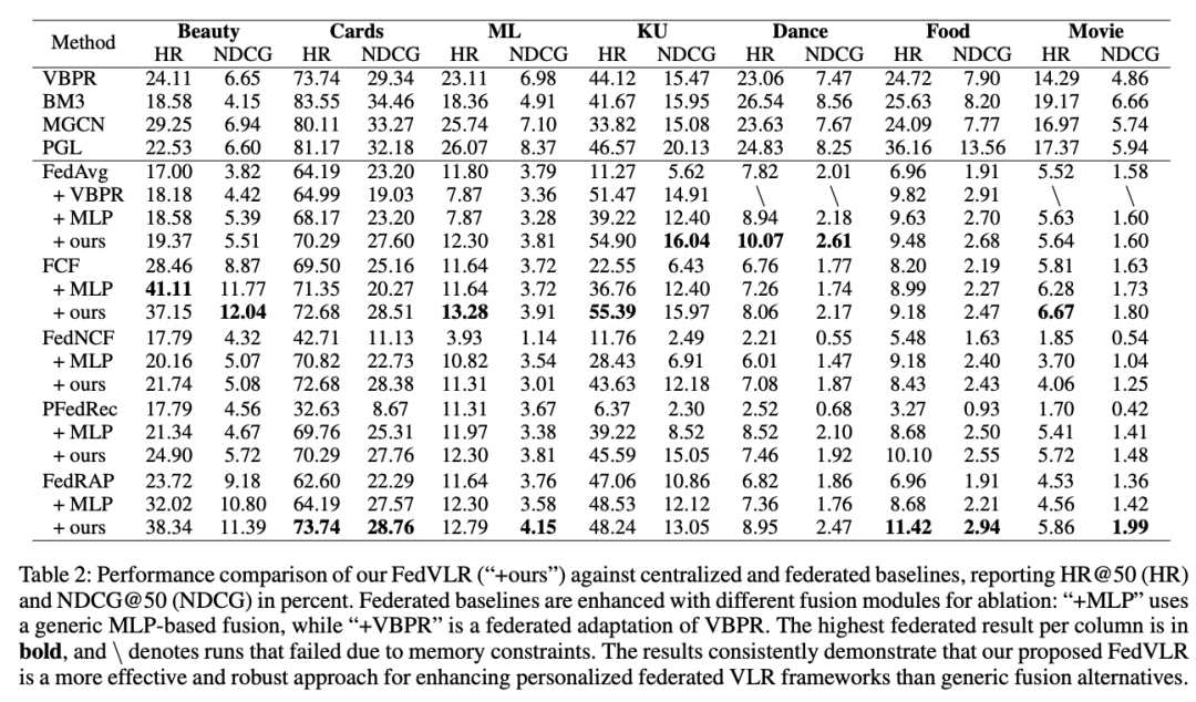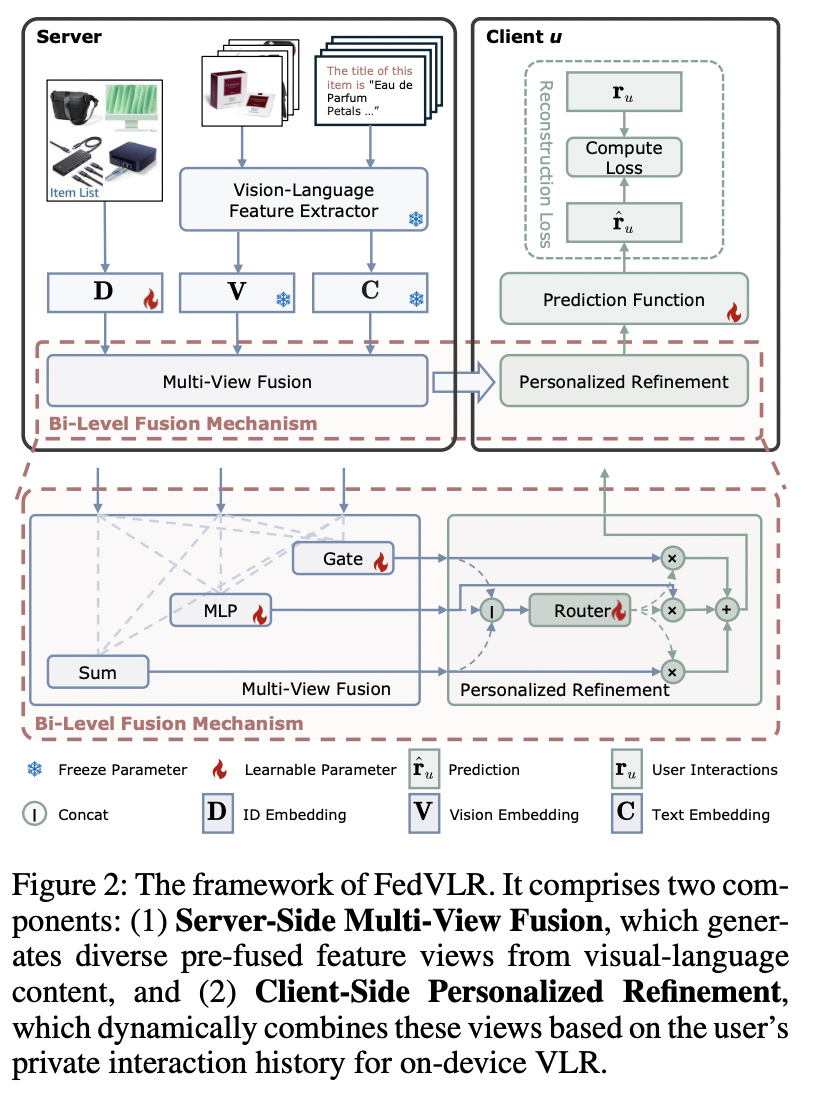 FedVLR 创新性地提出了一种双层融合机制,巧妙地解耦了特征提取与偏好融合。