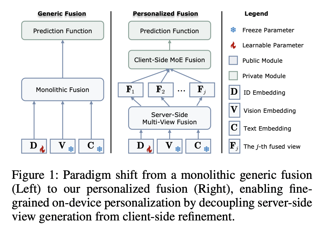 现有的联邦推荐往往面临两难:要么为了保护隐私而放弃繁重的多模态处理,仅使用 ID 特征;要么采用「一刀切」(One-size-fits-all)的粗暴融合策略,假设所有用户对图文的偏好一致。