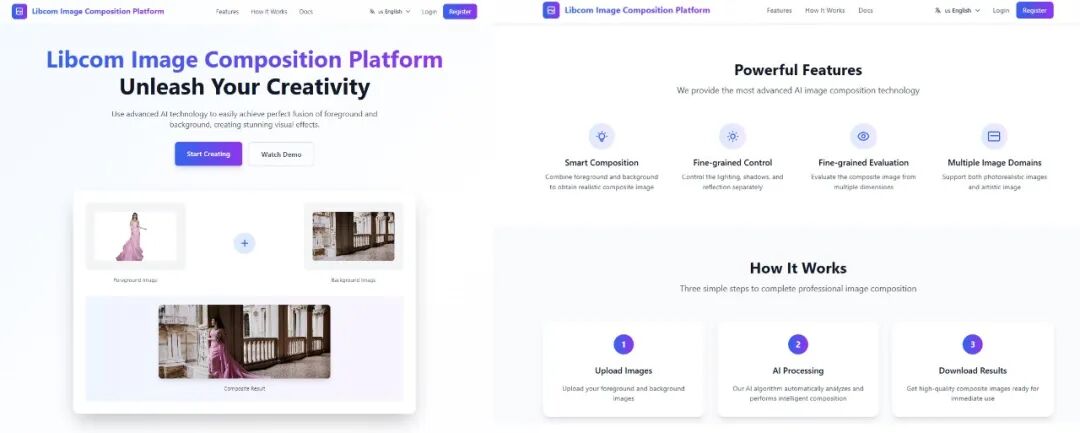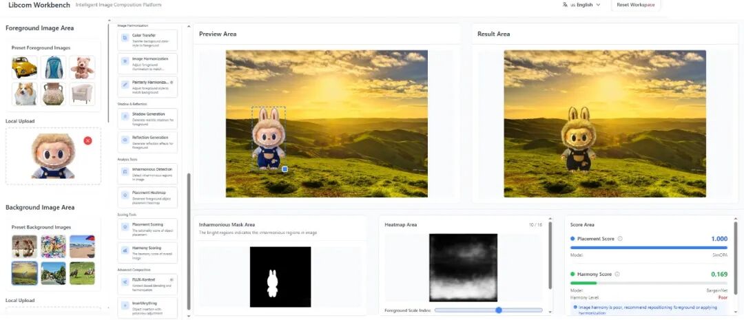 从 2018 年到 2025 年,牛力团队在图像合成领域积累了丰富的资源和成果。团队构建了 10 + 数据集,开发了 30 + 原创模型,并发表了 25 + 高质量学术论文。2023 年底,团队推出了 Libcom 工具箱(github.com/bcmi/libcom),无需进行训练微调,能够对任意图片实现开箱即用的图像合成功能。2025 年,团队将 Libcom 全面升级,并围绕 Libcom 的功能开发了便于用户使用的 Libcom 图像合成工作台。和通用图像编辑大模型不同,Libcom 工作台专注于图像合成领域,包括生成、检测、评估共计 12 项功能。