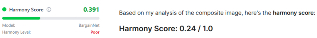 再让 Libcom 输出和谐度评分,进行 double check! Libcom 打分 0.391,分数很低,Harmony level poor。然后让 Banana Pro 给和谐度打个分,0.24 分,英雄所见略同!