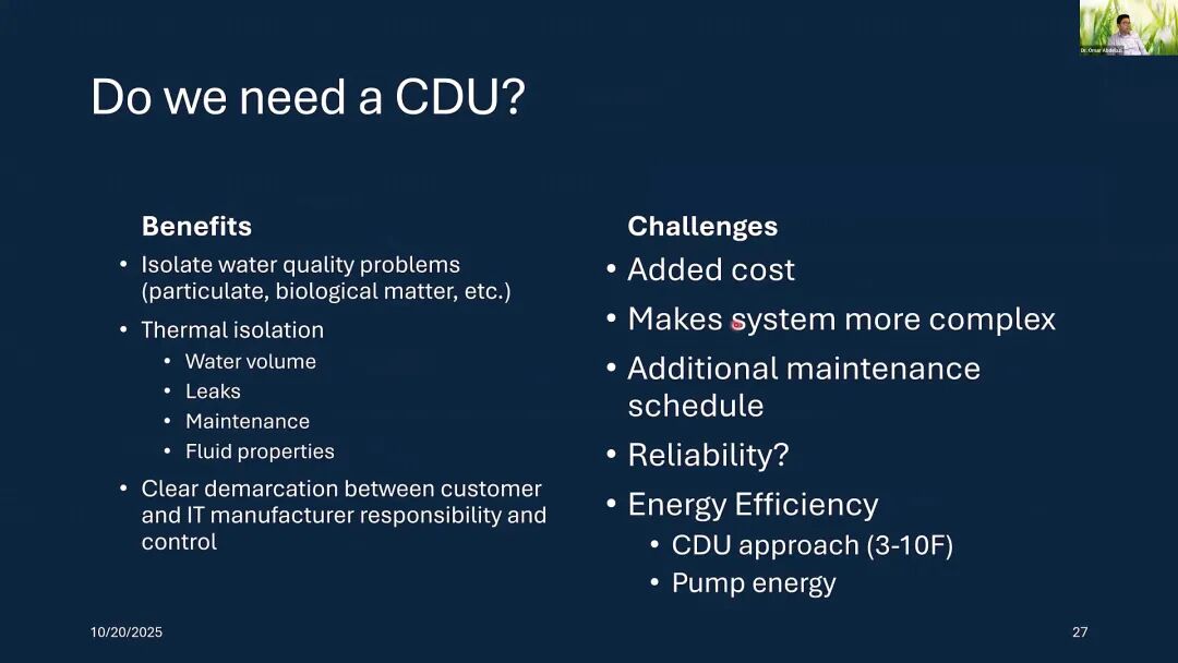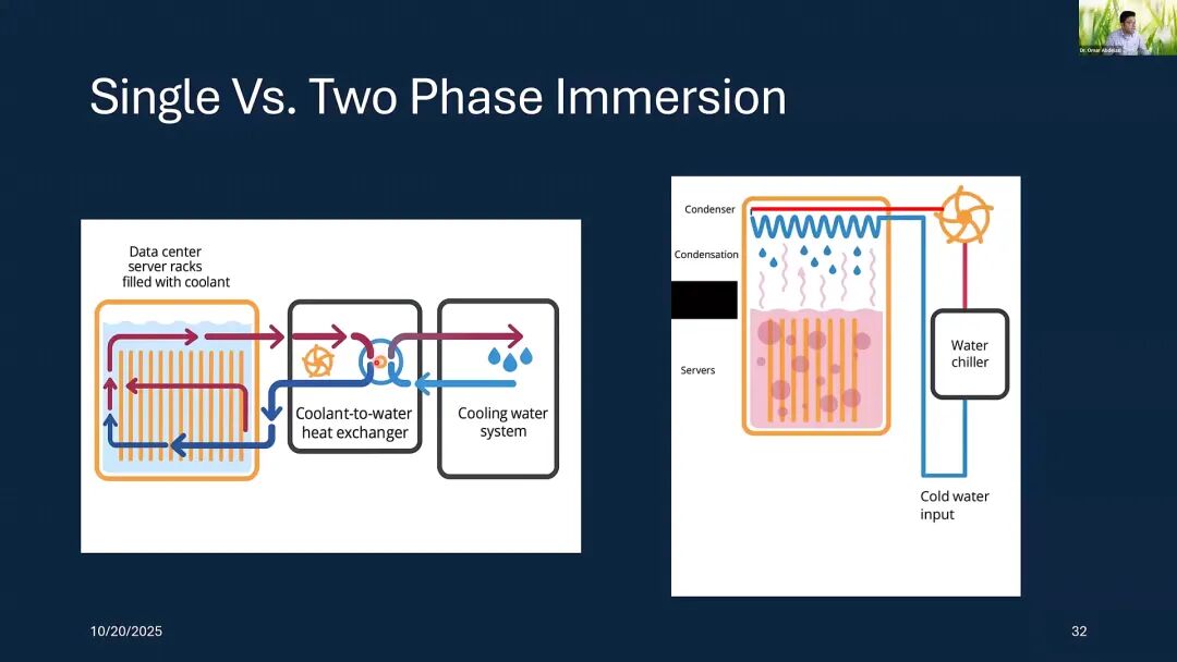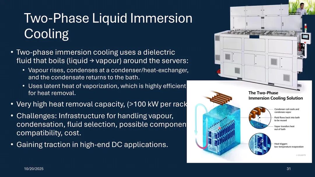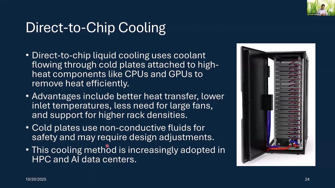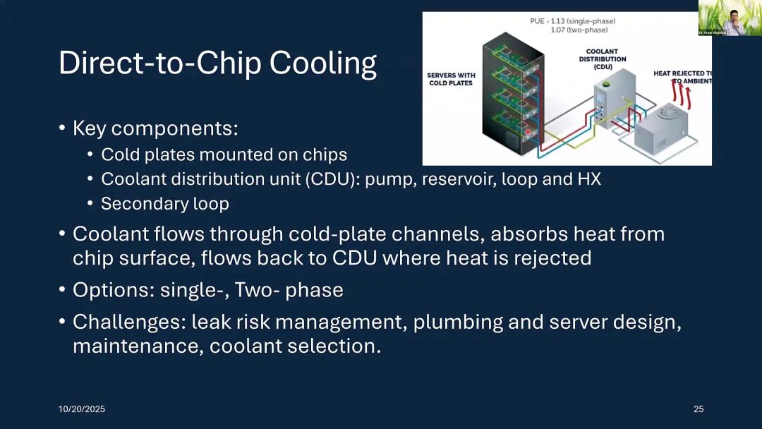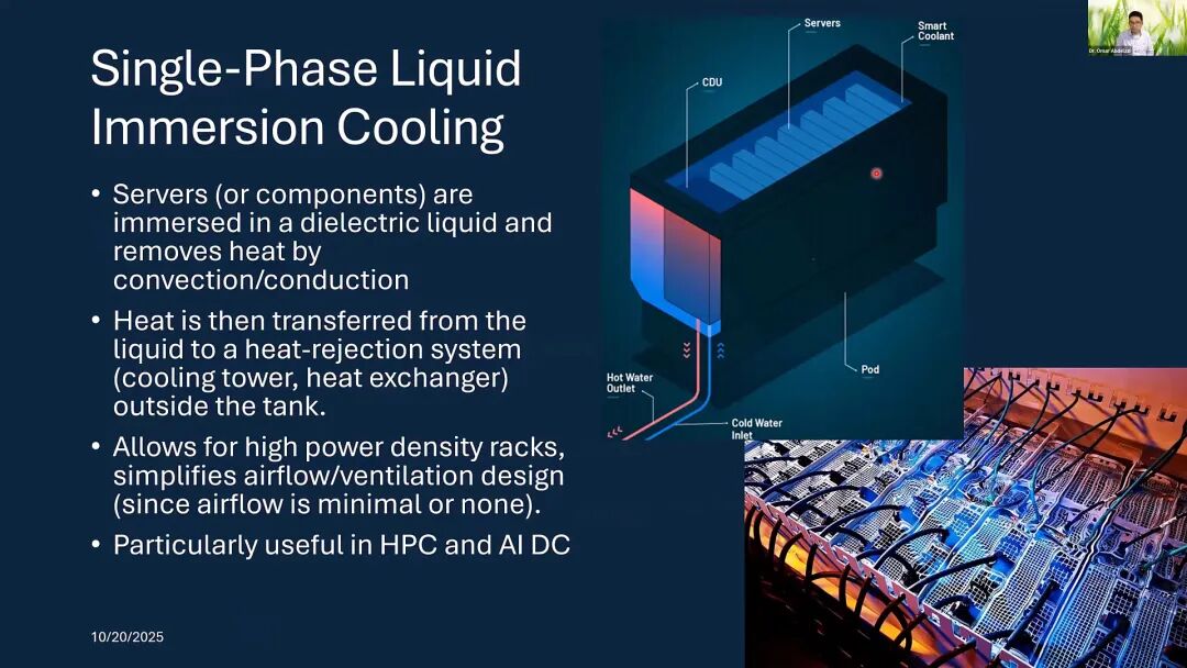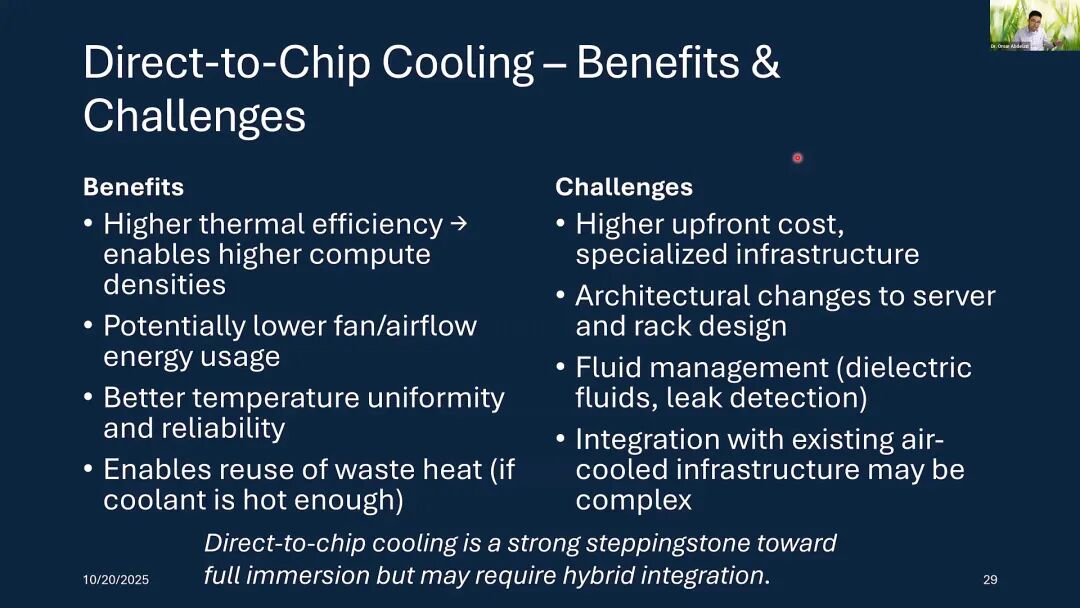 该技术分为单相和双相两种方案,单相系统 PUE 约 1.13,双相系统可低至 1.07。关键组件包括冷板、CDU(集成泵、储液罐和换热器)及二次回路,冷却液需选用非导电流体以保障设备安全。通过改造现有空冷数据中心,直接到芯片冷却可将 IT 容量翻倍(例如从 15MW 提升至 30MW),机架密度最高可达 120kW。