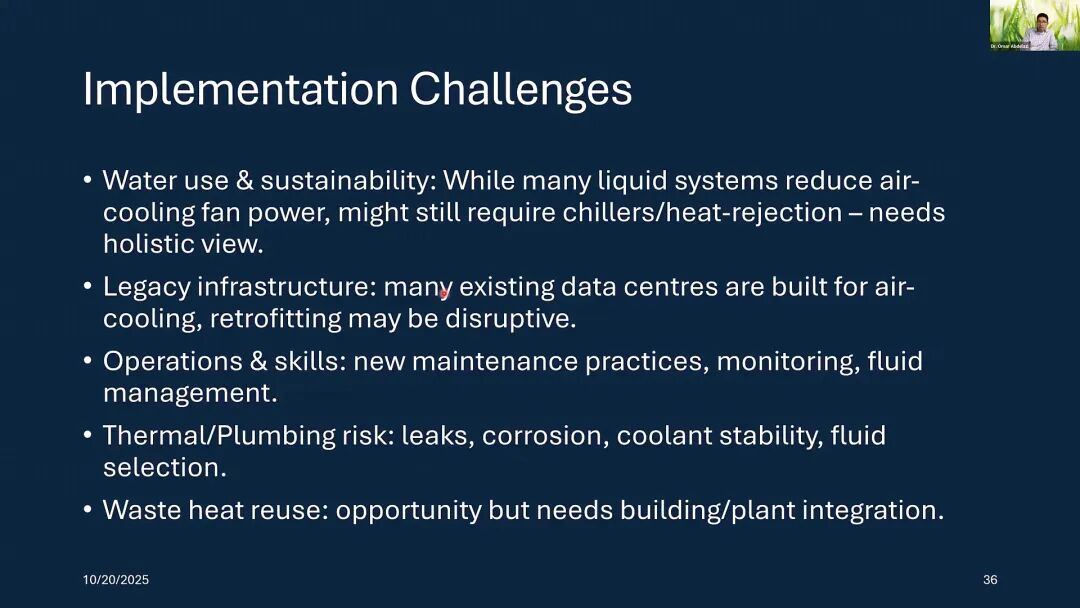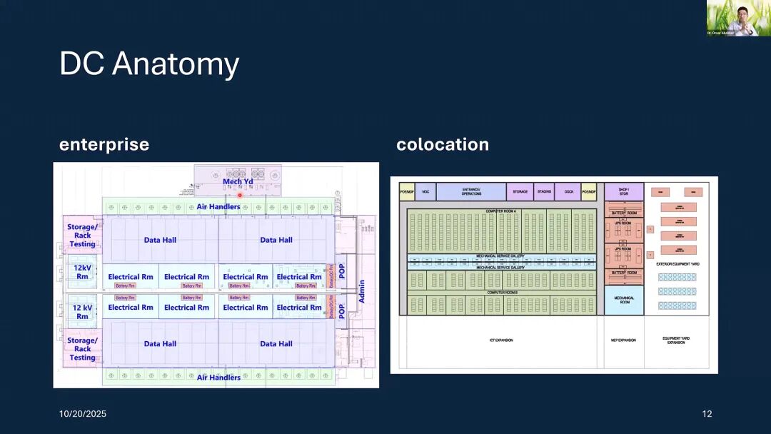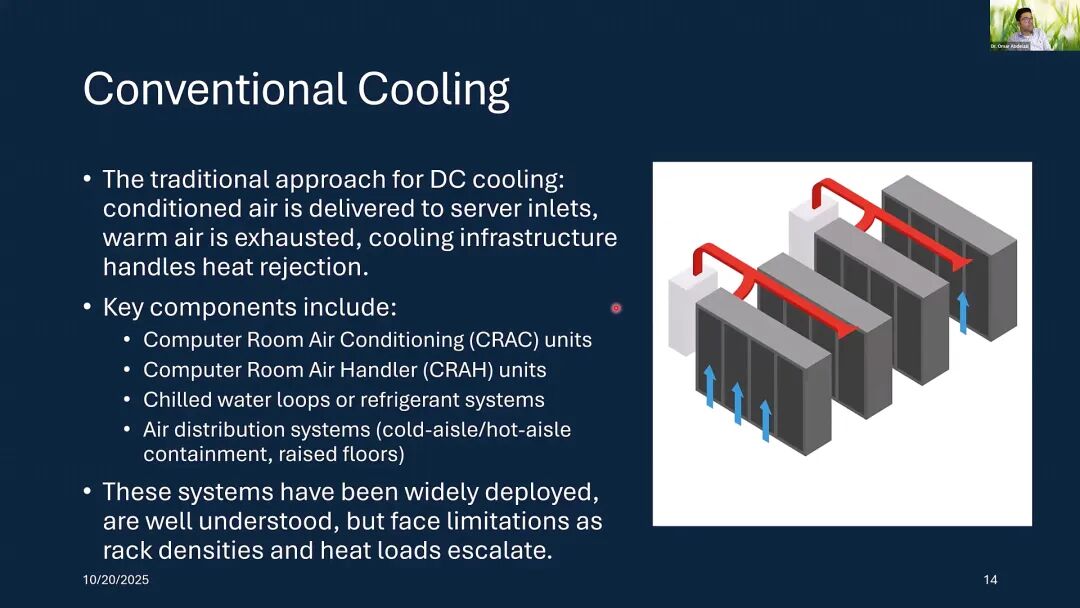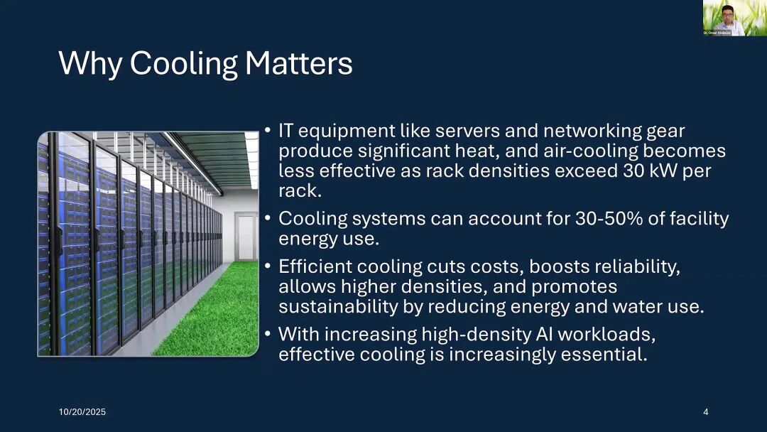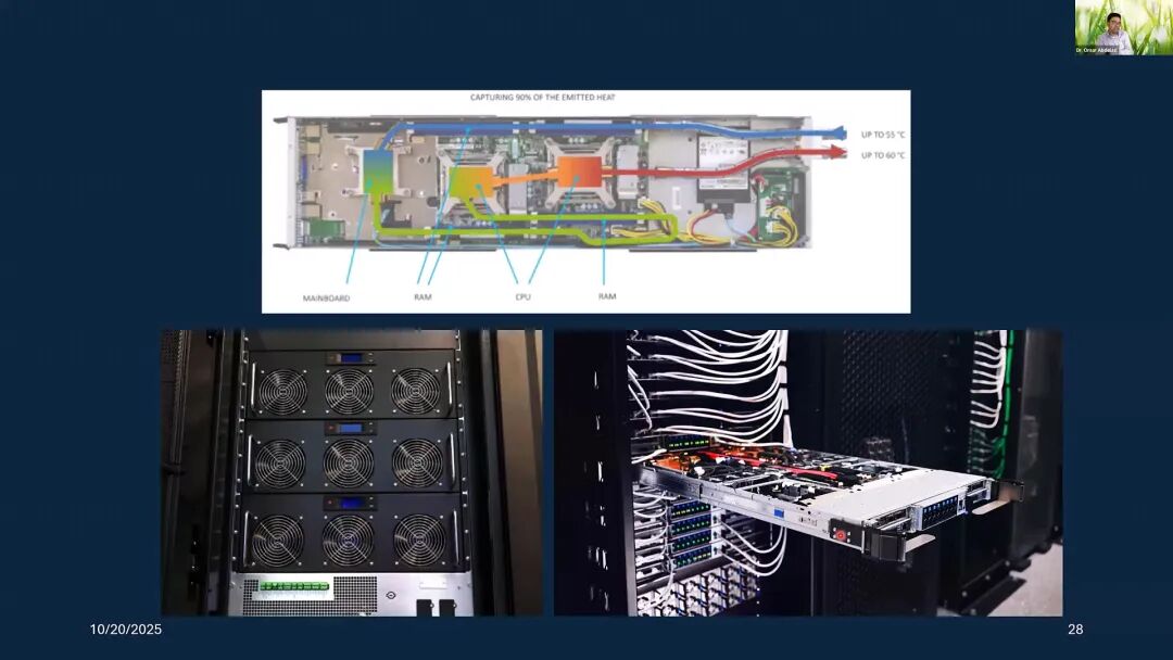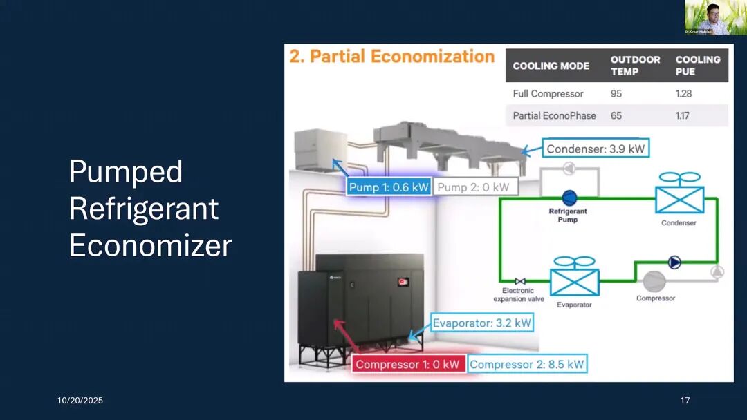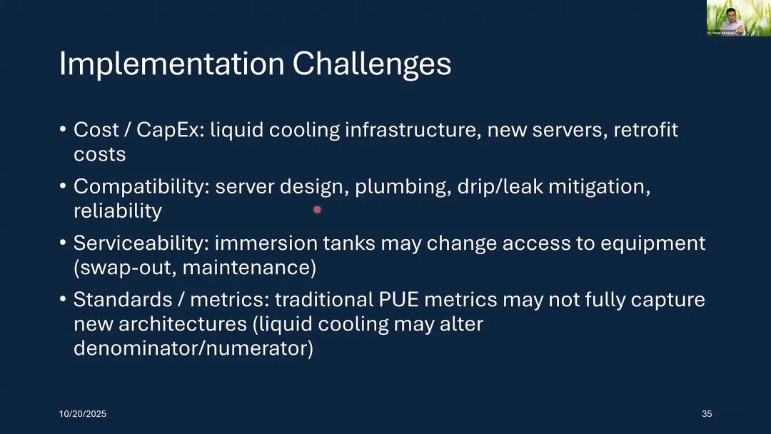 该技术分为单相和双相两种方案,单相系统 PUE 约 1.13,双相系统可低至 1.07。关键组件包括冷板、CDU(集成泵、储液罐和换热器)及二次回路,冷却液需选用非导电流体以保障设备安全。通过改造现有空冷数据中心,直接到芯片冷却可将 IT 容量翻倍(例如从 15MW 提升至 30MW),机架密度最高可达 120kW。