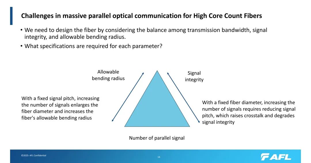 尽管大芯数光纤优势显著,但在大规模并行光通信中仍面临多重挑战,核心在于传输带宽、信号完整性与允许弯曲半径三者的平衡。当信号间距固定时,增加信号数量会导致光纤直径扩大,进而增大允许弯曲半径;而当光纤直径固定时,增加芯数需减小芯间距,这会加剧串扰,恶化信号完整性。
