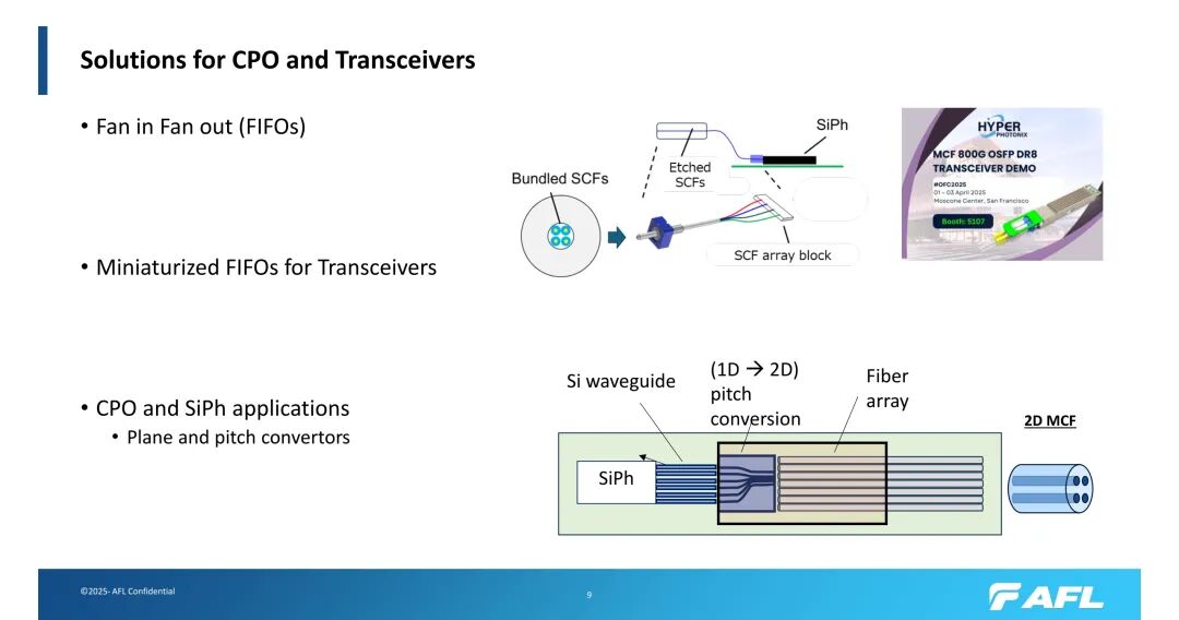针对共封装光学(CPO)和硅光子学(SiPh)应用,大芯数光纤配套推出了系列化解决方案。扇入扇出(FIFOs)组件通过刻蚀单芯光纤(SCFs)与SCF阵列块的组合,实现多芯与单芯的灵活转换;小型化FIFOs适配收发器需求,已成功应用于800G OSFP DR8收发器演示。此外,平面和间距转换器可实现硅波导从1D到2D的间距转换,通过光纤阵列与2D MCF、SiPh的协同,支撑高速并行传输,为CPO架构的落地提供关键支撑。