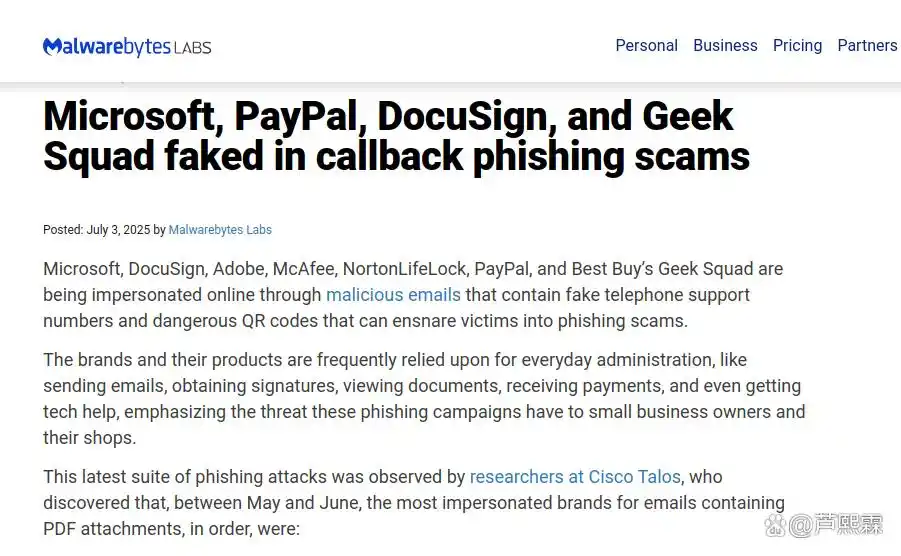随着企业数字化转型加速,微软Office 365、PayPal支付、DocuSign电子签名及Geek Squad技术支持等服务已成为商业运营和个人日常不可或缺的基础设施。这些品牌因其高可靠性与广泛使用,在用户心智中建立了深厚的信任基础。然而,这种信任正被网络犯罪分子系统性滥用。据Cisco Talos 2025年7月发布的报告,在2025年第二季度,微软、NortonLifeLock、PayPal、DocuSign和Geek Squad依次成为回拨钓鱼攻击中最常被仿冒的品牌,其共同特征是均涉及高频次、高敏感度的用户交互场景——如账单支付、账户验证、文件签署或设备维护。