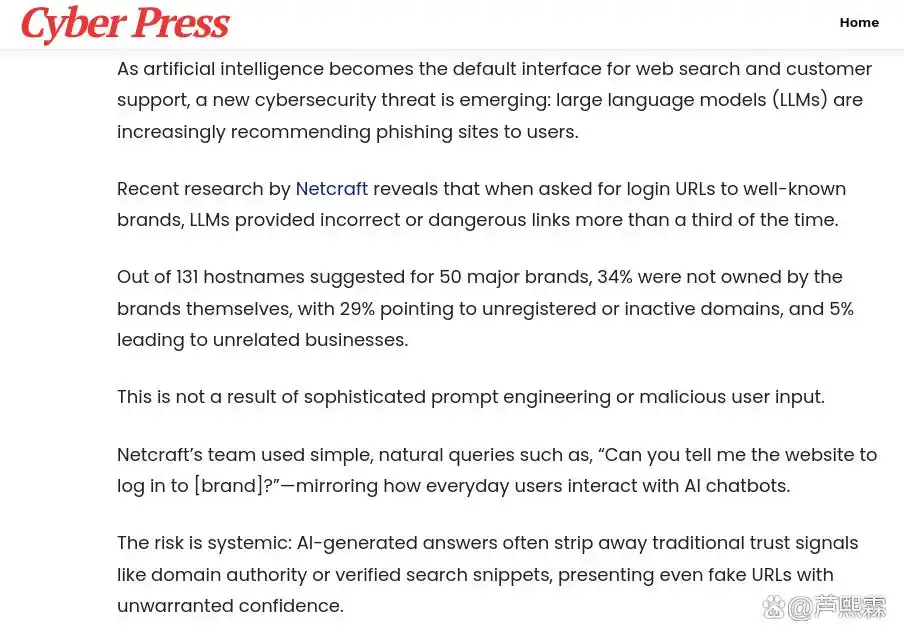 分析:LLM依赖训练数据中的高频共现关系推断“正确”答案,但无法验证当前域名状态。攻击者只需在多个平台发布包含“brand login → fake-url”的配对文本,即可提升其在模型输出中的权重。