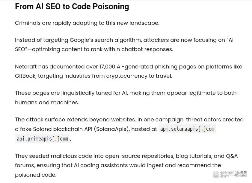 除文本与网页外,生成式AI亦被用于污染软件开发供应链。攻击者创建伪造的API文档(如api.solanaapis.com),并在Stack Overflow、GitHub Gist等开发者社区发布包含恶意调用的代码片段。当程序员使用AI编程助手(如GitHub Copilot、Cursor)查询“如何连接Solana钱包”时,模型可能推荐包含该伪造API的代码: