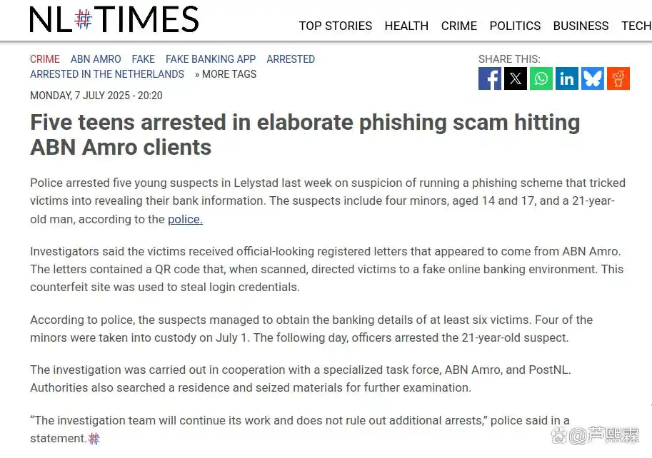 2025年7月初,荷兰警方在莱利斯塔德(Lelystad)逮捕五名涉嫌策划并实施针对ABN AMRO银行客户的钓鱼诈骗案的青少年。据官方通报,该团伙包括四名未成年人(14至17岁)及一名21岁青年,通过伪造带有QR码的“官方挂号信”,诱导受害者扫描后跳转至高仿真银行登录页面,进而窃取账户凭证。截至案发,至少六名客户信息被成功窃取,部分资金已被转移。