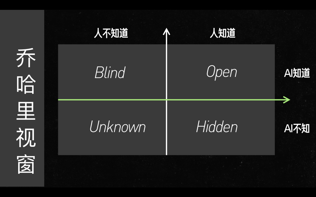 整个框架由横、纵两个轴切割的四象限组成,横轴左右分别表示人不知道和人知道,纵轴上下分别表示AI知道和AI不知道。