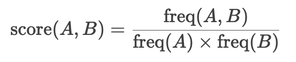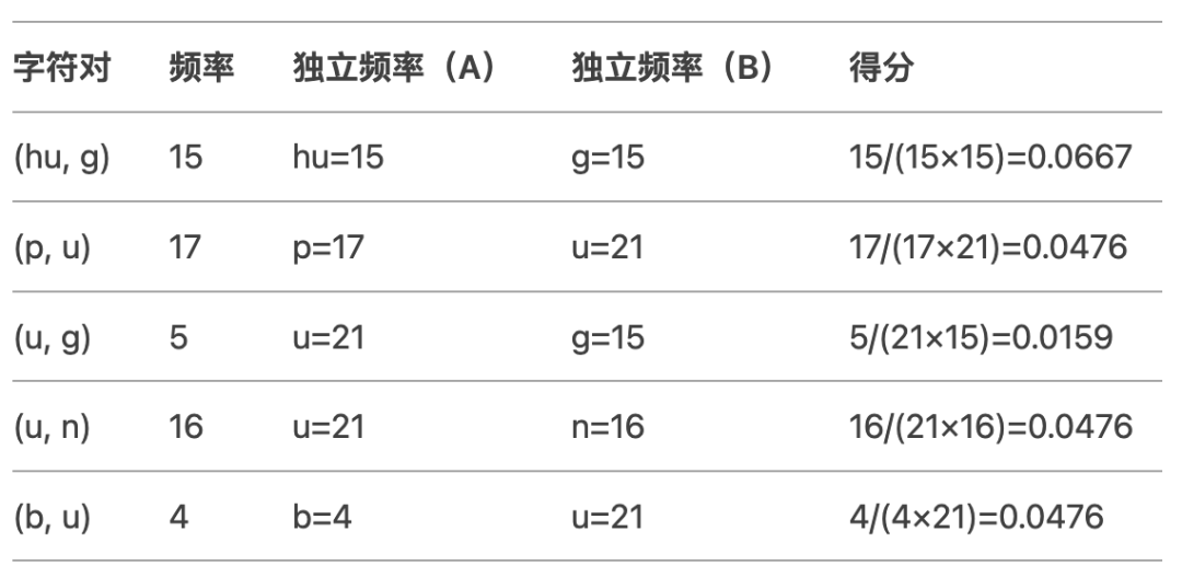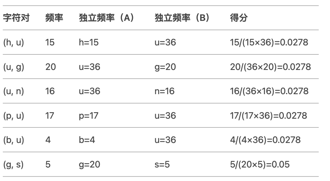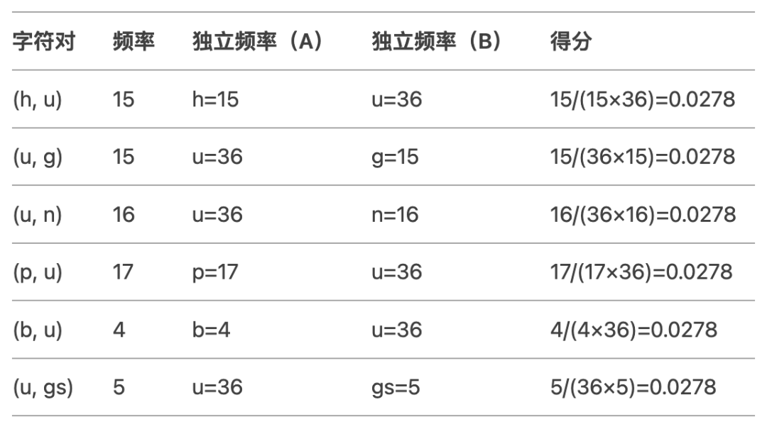 其中,freq(A)和freq(B)是字符A和B的独立频率,freq(A,B)是它们连续出现的频率。分数越高,说明A和B的共现越有意义。