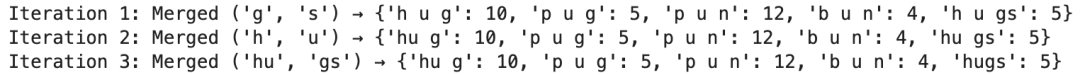 合并结果:将 hu g 合并为 hug,更新训练语料: