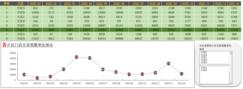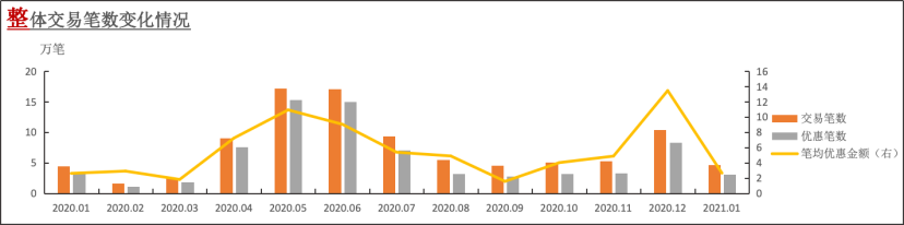 该品牌商户实行片区管理后,2020年1月至2021年1月各月线下门店的整体交易笔数情况如下,在年中及年末因促销活动的原因,交易上涨。