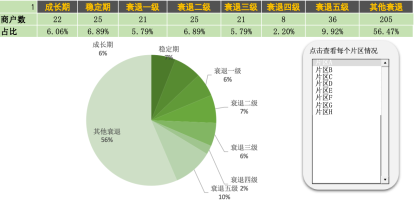 结合门店的生命周期,计算各片区各生命周期状态门店的分布情况。从门店生命周期结构来看,处于成长期、稳定期的门店较少,衰退期门店占主要部分,现阶段需重点关注门店促活问题。片区A门店生命周期分布示例如下: