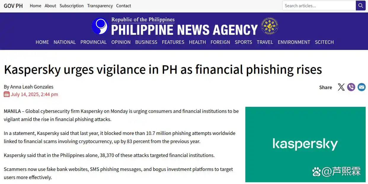 电子邮件作为低成本、高覆盖的通信工具,长期被网络犯罪分子用于实施大规模钓鱼攻击。2025年7月,菲律宾国家警察通报破获一起典型金融钓鱼诈骗案:犯罪团伙通过精心伪造来自本地主要银行(如BDO、BPI)及社会保障署(SSS)的电子邮件,以“账户异常”“退税通知”“身份验证更新”等为诱饵,诱导收件人点击嵌入链接,跳转至高仿登录页面,窃取用户名、密码、OTP甚至银行卡信息。据警方披露,该团伙已运作数月,受害者遍及全国多个省份,部分资金通过加密货币混币器转移,追回难度极大。