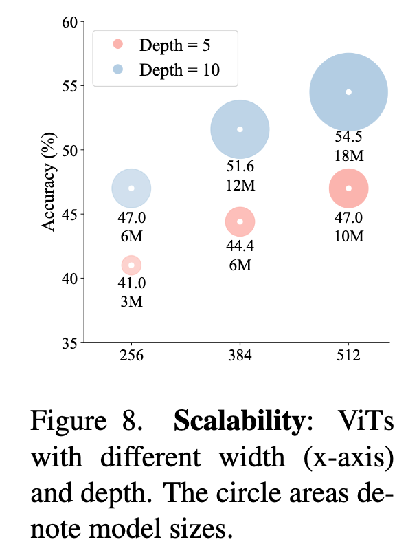 可扩展性 。在图 8 中,我们展示了具有不同深度和宽度的 ViT。在这个范围内,本文方法展示了良好的可扩展性:增加深度和/或宽度会由于更好的拟合而导致更高的准确率。超过这个范围可能会导致在当前设置下的过拟合,如表 1 中 66M ViT 模型所示。我们观察到这个较大的模型实现了更高的训练准确率,表明未来的研究应关注泛化。