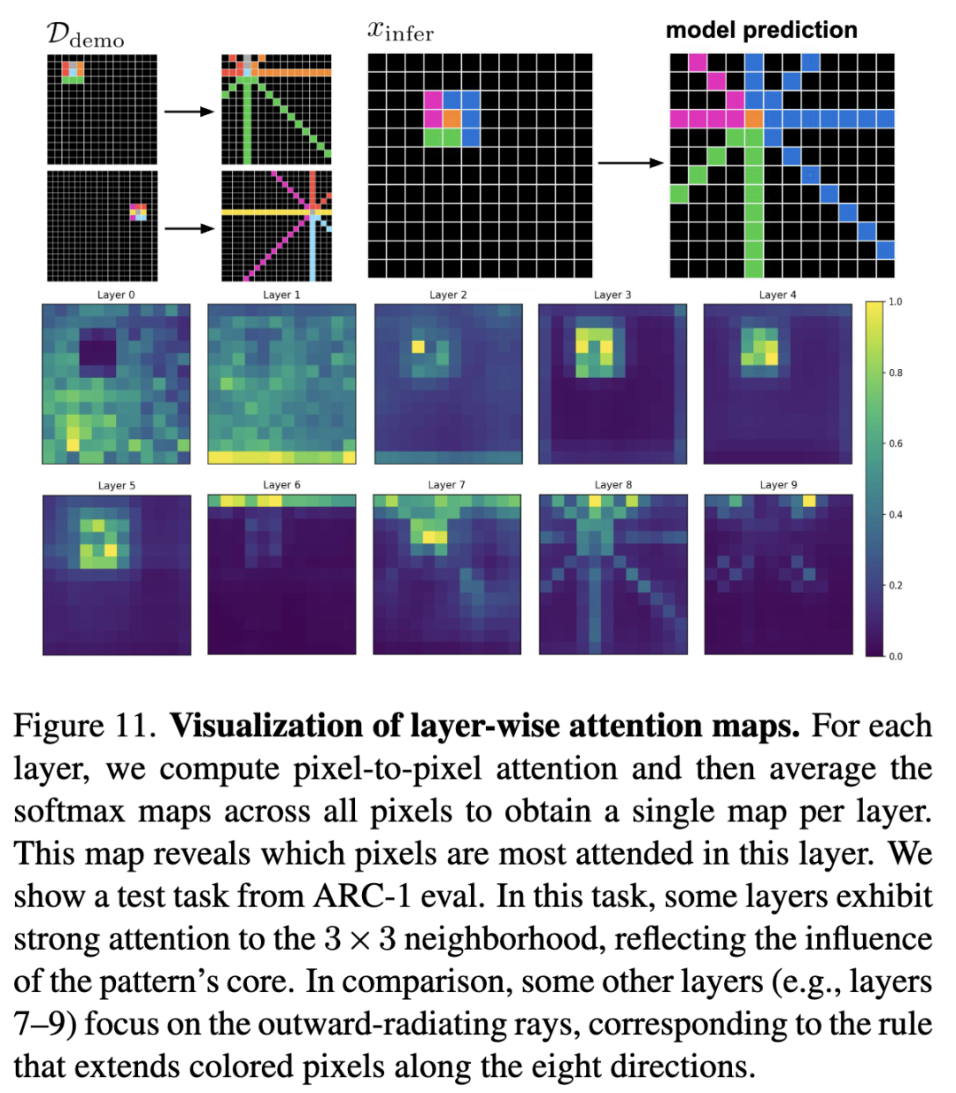 图 11 可视化了另一个测试任务的逐层注意力图。逐层图是该层中所有像素平均后的 Softmax 注意力图:它揭示了在该层中哪些像素受到了最多的关注。在这个任务中,不同的层表现出不同的专长:有些层关注要被复制的像素,而有些层关注沿八个方向的目标线。