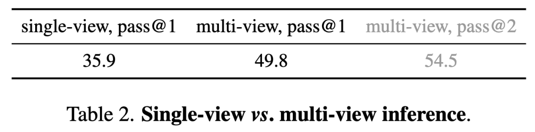 单视图对比多视图推理 。如前所述,我们默认采用多视图推理。为了完整性,也检查了单视图推理的准确率。由于单视图推理无法产生多个预测,比较 pass@1 准确率。见表 2。
