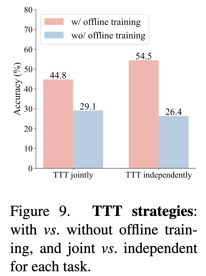 测试时训练 (TTT) 策略 。在图 9中,研究了有无离线训练的 TTT,以及针对每个测试任务联合执行 TTT 与独立执行 TTT 的对比。