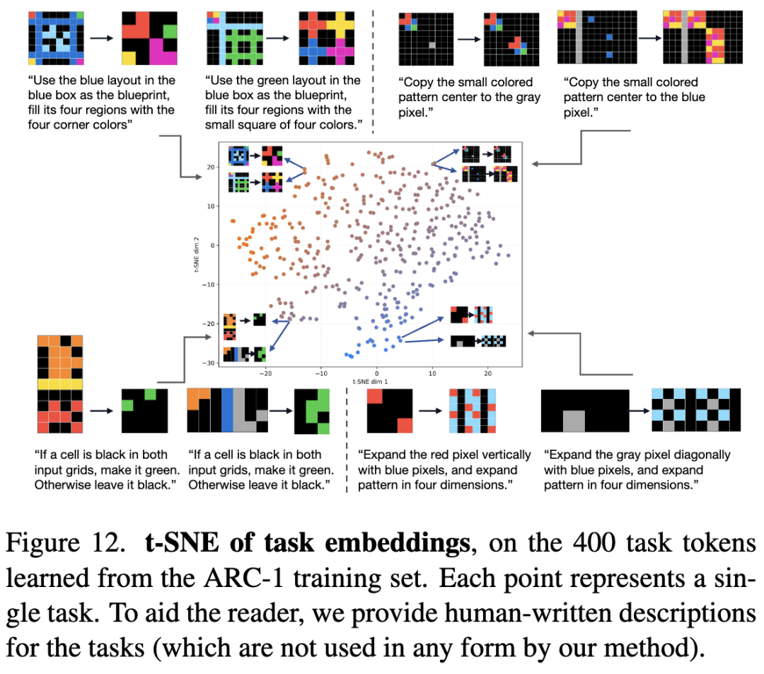 任务嵌入的 t-SNE 。本文模以任务 Token 为条件,并通过学习得到的嵌入来表示每个任务。在 ARC-1 的 400 个训练任务中,本文模型在离线训练中学习了 400 个不同的任务嵌入。通过 t-SNE 将这 400 个嵌入可视化在 2D 空间中(见图 12)。每个点对应一个任务。