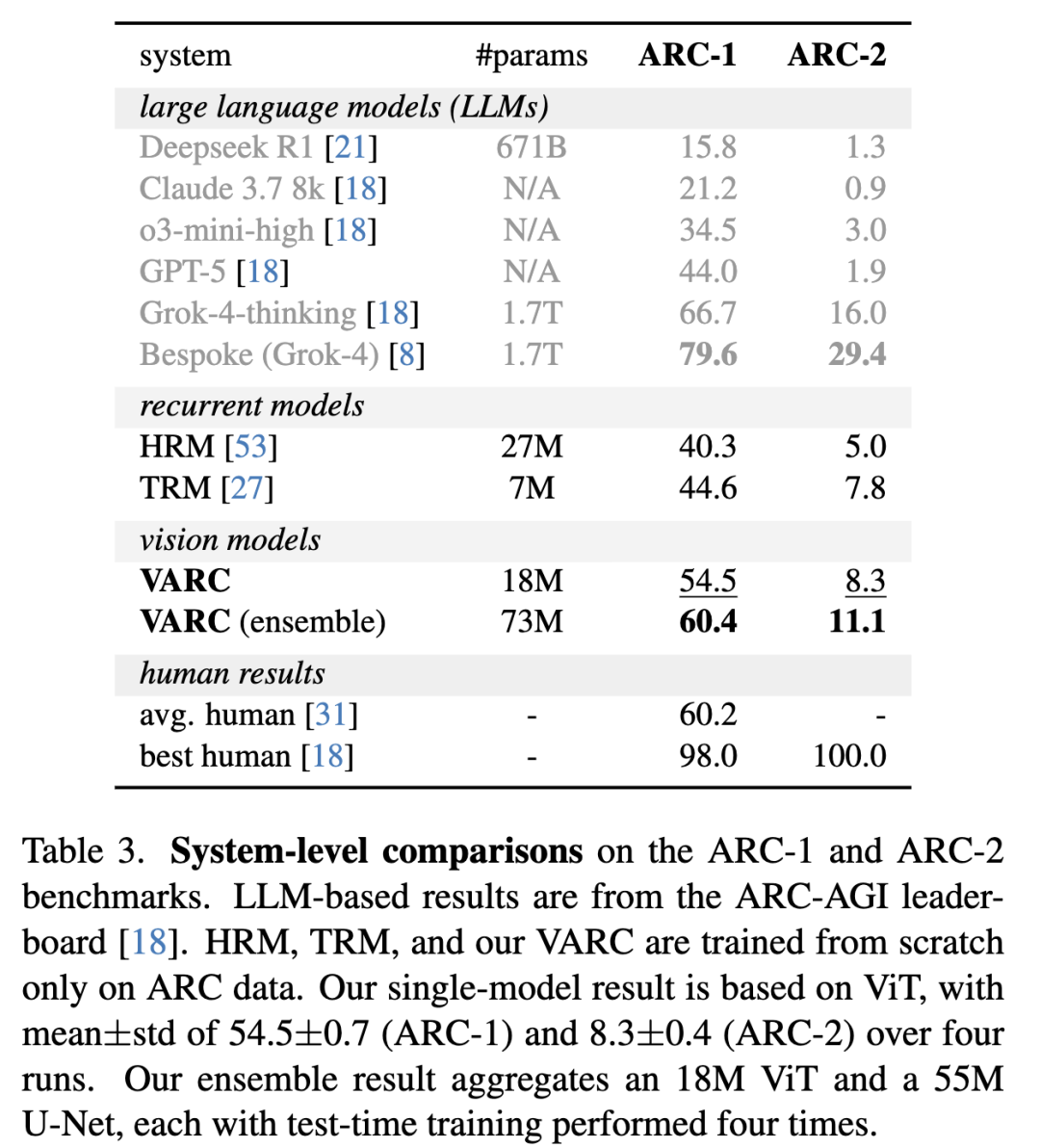 在表 3 中,在 ARC-1 和 ARC-2 上与领先的基于 LLM 或递归模型的结果进行了比较。(本文 ARC-2 模型仅在 ARC-1 数据集上训练,并在 ARC-2 集合上进行测试时训练和推理。)