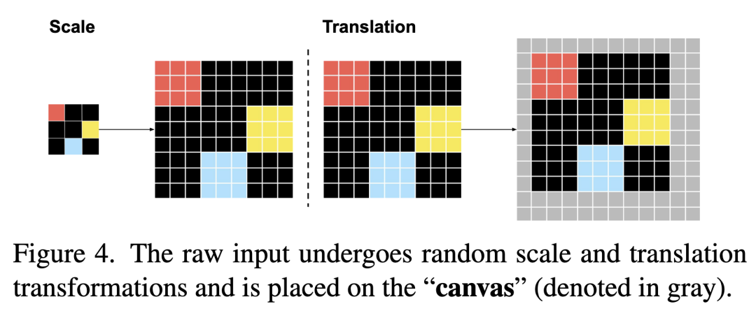 画布 (Canvas) 。在我们表现最好的模型中,画布大小为 。在 ViT 的情况下,图块(patch)大小为 ,导致序列长度为 。对于缩放增强,随机采样一个整数缩放比例,使得缩放后的网格不大于画布大小。对于平移增强,随机采样左上角,但要满足放置的图像完全可见的约束。