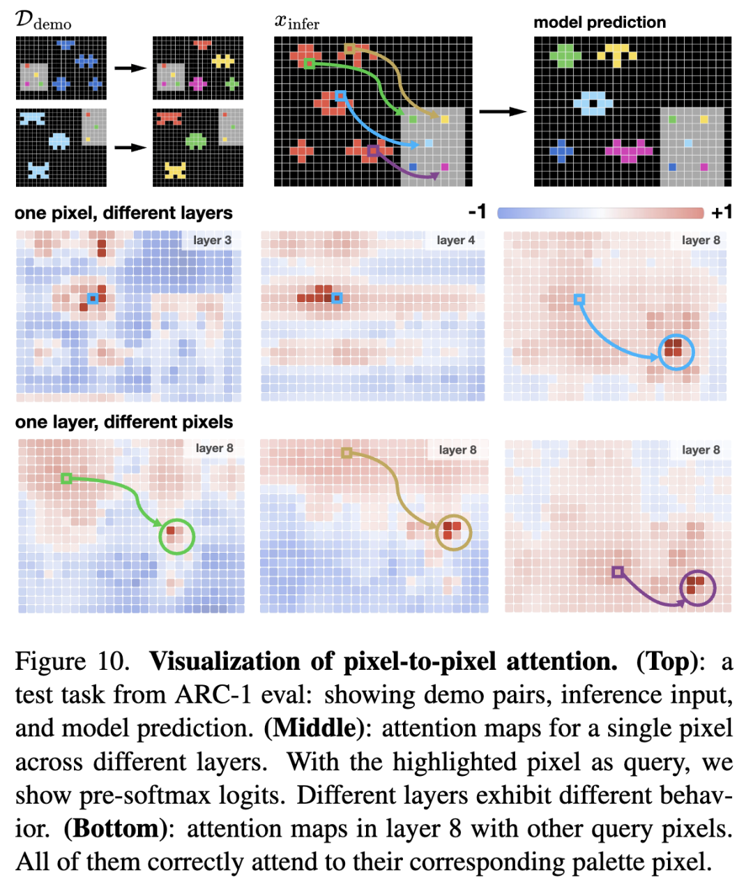 注意力模式 。图 10 展示了本文 ViT 模型在一个测试任务中的注意力模式。这些注意力图显示,本文模型能够正确推理源像素与其要复制的目标像素之间的关系。