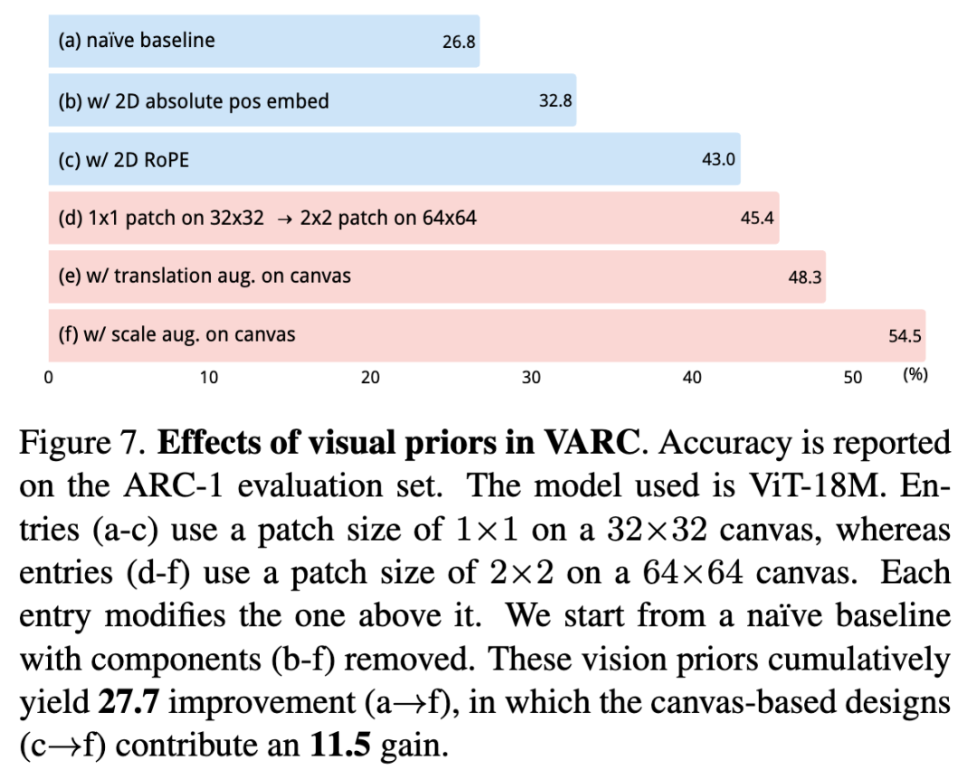 平移和缩放增强 。在图像识别中,即使是能力极强的网络架构仍然极大地受益于平移和缩放增强。我们在 ARC 中得出了类似的观察结果。见图 7(e,f)。