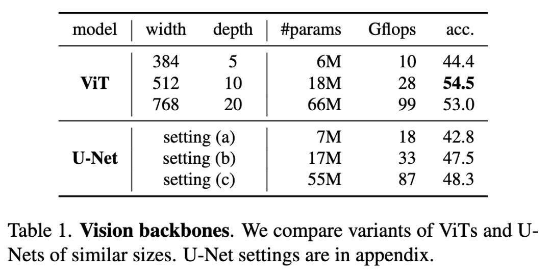 ViT 对比 U-Net 。在表 1 中,我们比较了 ViT 与 U-Net(一种卷积网络)。我们评估了每种架构的三种模型尺寸。尽管 ViT 一致地表现更好,但所有 U-Net 变体都达到了不错的准确率,表明这个问题也可以通过经典的视觉主干网络有效地解决。