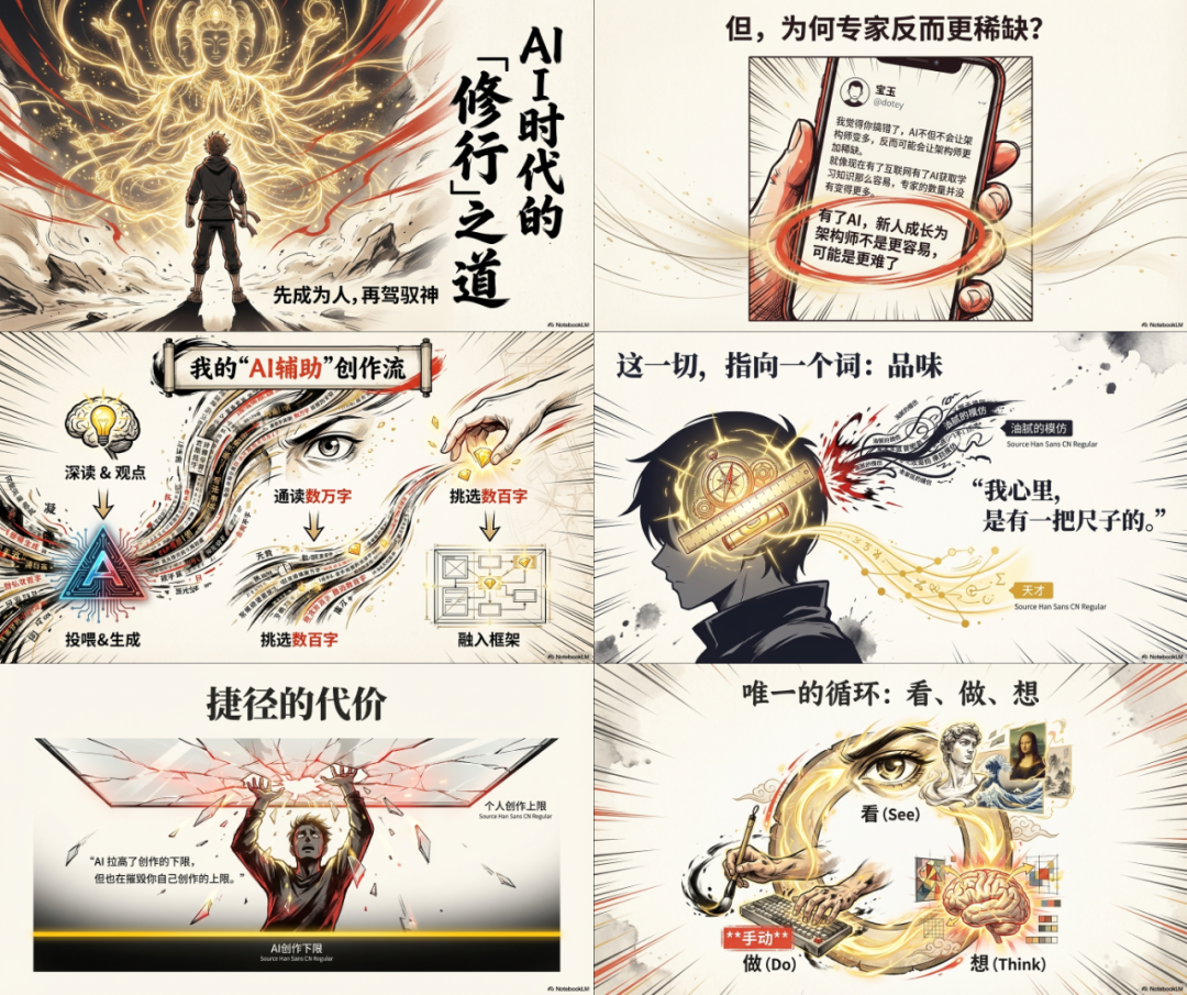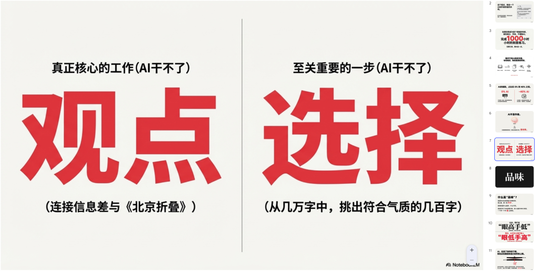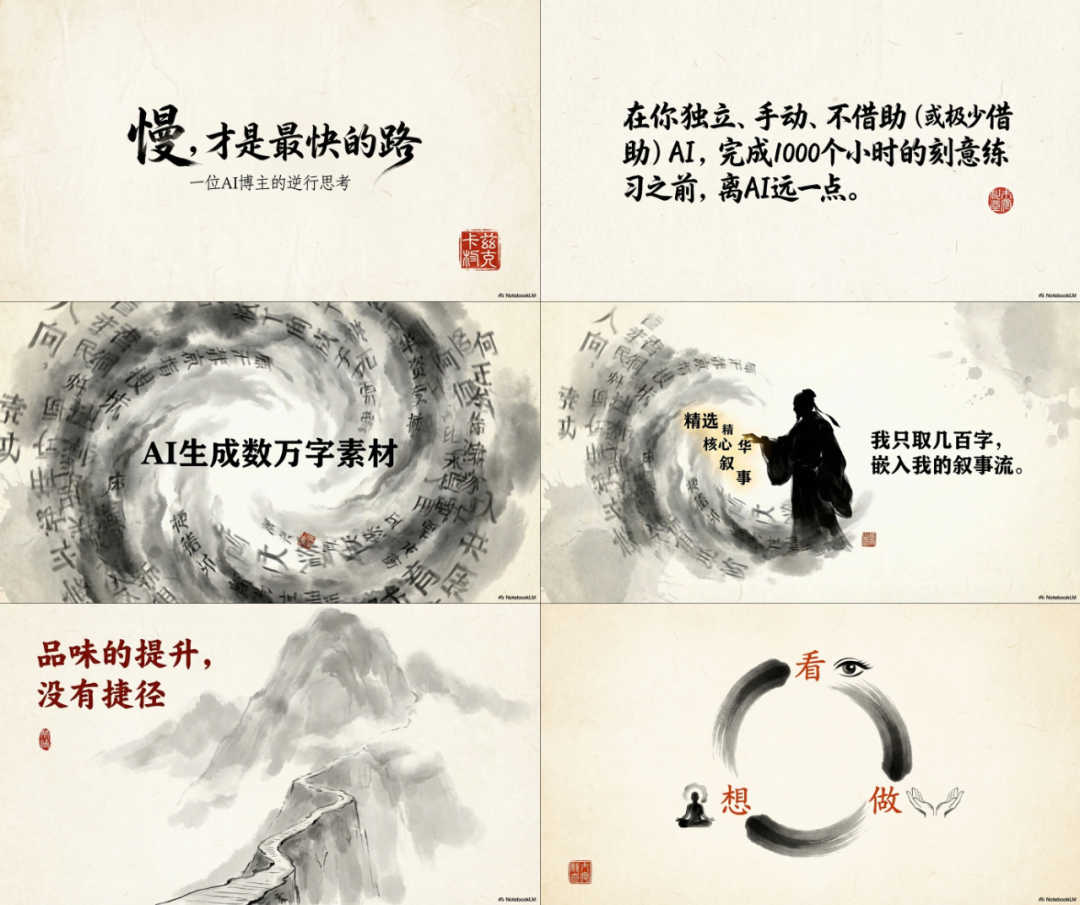而这一切的一切,都只是我把要转PPT的原始素材,扔了了NotebookLM,然后NotebookLM在拆解之后,调用Nano Banana Pro生成的。