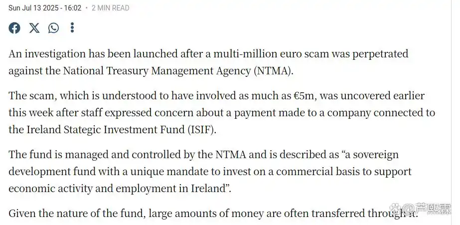 近年来,针对政府关键基础设施的网络攻击呈现显著上升趋势,其中以金融与财政部门为高价值目标的定向钓鱼攻击尤为突出。2025年7月曝光的爱尔兰国家财政管理局(NTMA)资金失窃事件,成为此类攻击的典型样本。据官方通报,攻击者通过伪造投资公司“资本调用”(capital call)请求,诱使内部财务人员执行一笔约500万欧元的转账操作。值得注意的是,NTMA明确表示其IT系统未遭技术性入侵,漏洞源于“人为判断失误”——即员工未能识别精心伪装的欺诈性指令。这一结论揭示了一个长期被低估的风险维度:在高度自动化的财政支付流程中,人的认知偏差与流程盲区可能成为整个安全链条中最薄弱的一环。