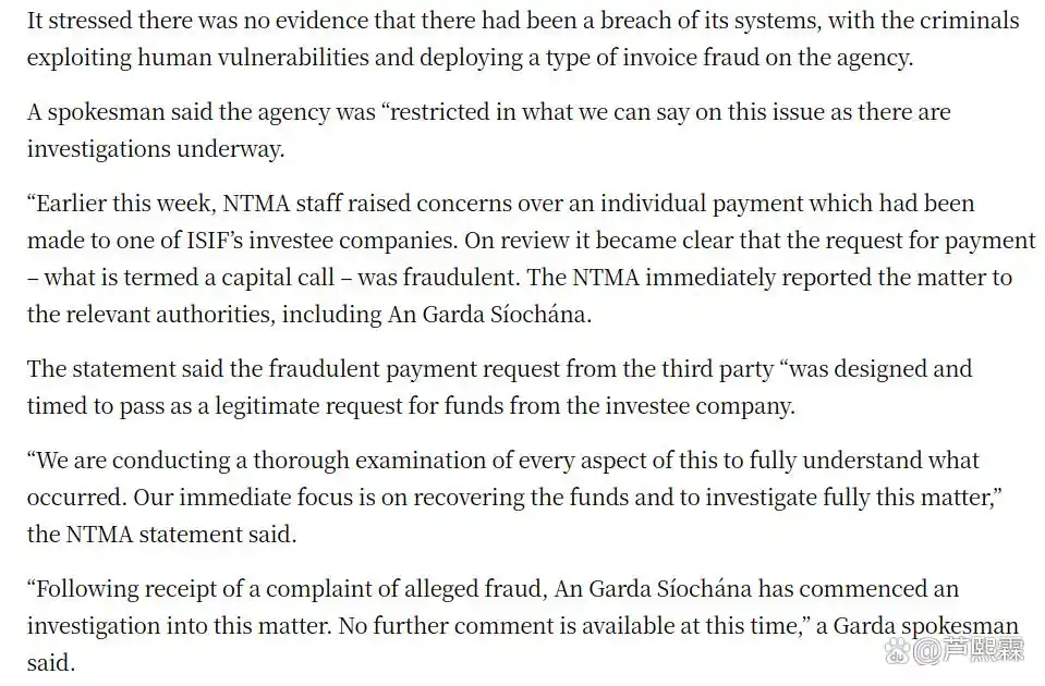 NTMA是爱尔兰政府全资拥有的法定机构,负责国家债务管理、现金调度及主权财富基金运营。其下属的爱尔兰战略投资基金(Ireland Strategic Investment Fund, ISIF)以商业化方式投资于促进本国经济与就业的项目。ISIF的典型运作模式包括:向被投企业发出“资本调用”指令,要求后者提供项目进展证明后,由NTMA财务部门执行资金划转。此类支付通常金额巨大、频率较低,且依赖邮件或内部系统传递指令。